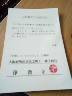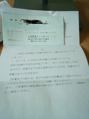 人形が到着して、支払いを確認すると「人形供養ドットネット」から領収書と確認の手紙が送られてきます。