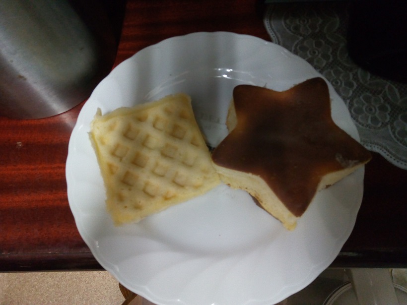 ワッフルはぎゅってしちゃったから「ぎゅぎゅ」って食感だったけど、ホットケーキは表面は焦げていたけど、中はふわふわ食感だったよ!