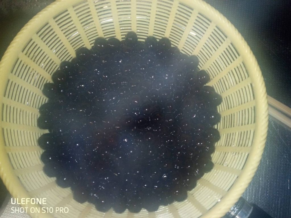 同じタイミングでお湯に放り込んだのに、なかなか黒くならない分があって心配だったけど、全部お馴染みのブラックタピオカになったわよ。